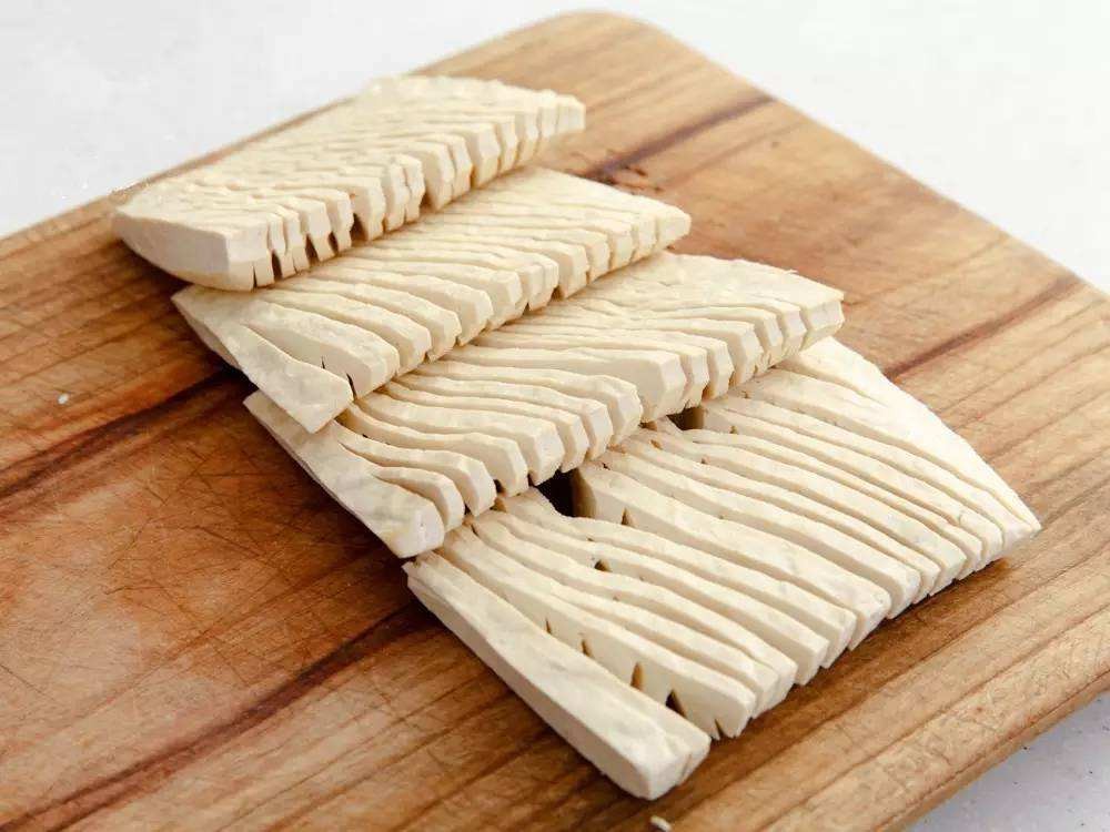 做兰花干最难的地方就是切花刀,取一块豆干,沿两边各摆放一竹签,先切竖刀,切到豆干厚度的三分之二处即竹签的位置停下,一块豆干可以竖切12刀。切完后翻面,切斜刀,同样切到三分之二处,斜切16刀。