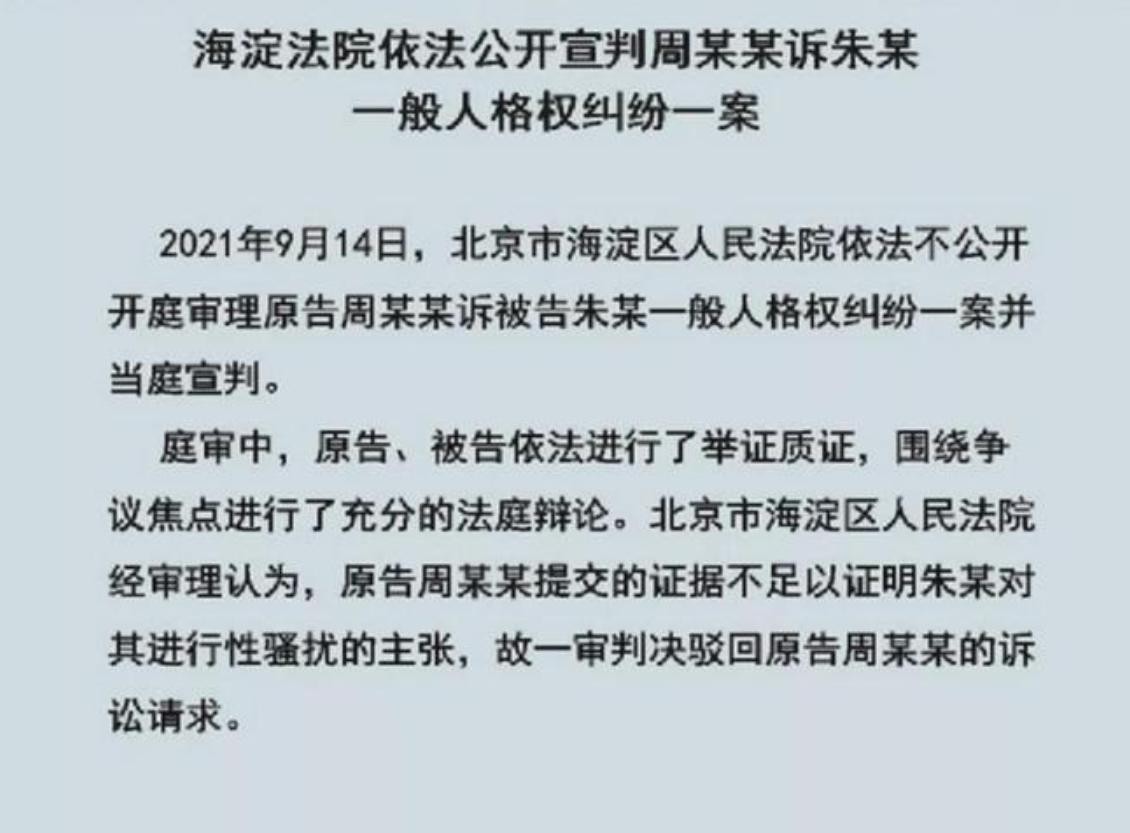 2021年9月14日,北京海淀区人民法院依法判决:原告弦子提交的证据不足以证明朱军对其性骚扰,驳回原告所有诉讼请求。