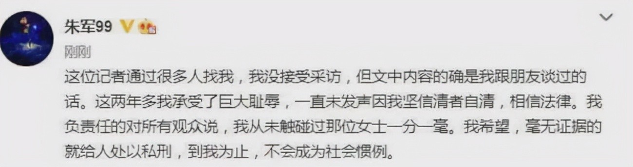 朱军解释道,是因为有纪律,有要求,自己没有办法做回应,并相信法律会还自己清白。
