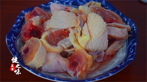 步骤一:鸡腿最好用新鲜的鸡腿,也可以用鸡肉,如果没有就将就用冷冻的也行,将鸡腿清洗干净,然后放到案板上面,用砍刀剁成均匀大小的小块,剁好之后装盘备用。