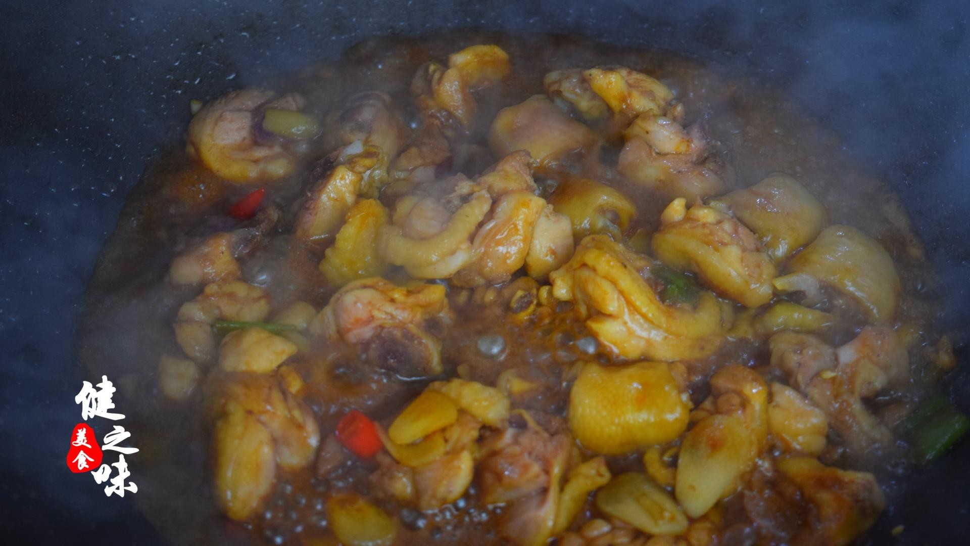 步骤四:等鸡肉炒至表面焦香之后,放入半杯生抽,放入料酒半杯,放入清水半杯,然后盖上锅盖,大火煮开之后,转成小火,焖煮10分钟!