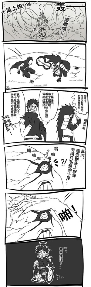 第二则漫画是关于斑爷和带土召唤出十尾的场景,斑爷和带土召唤出十尾之后十分的激动,因为两人多年的努力奋斗终于得到了实现。咦漫画中的斑爷吃着香蕉还开起了车,看来斑爷还是放不下柱间呀。最激动的莫过于带土叫嚣着着要撸死卡卡西等木叶弱鸡对手,带土还表示有了十尾这个强大的外挂他再也不用担心死了。十尾似乎感觉到自己的头顶有两个“苍蝇”很烦人,所以直接往头顶一拍,带土和斑爷还没装完逼直接被十尾拍死火影全剧终。