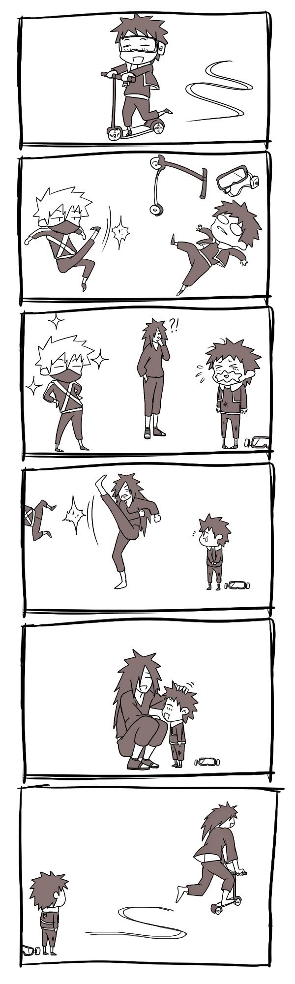 第三则是关于带土和卡卡西的同人漫画,带土在大街上不停的炫耀自己新买的滑板车,这时刚好的路过的卡卡西被带土嘲讽,暴脾气的卡卡西一脚踢翻带土直接溜掉,斑爷作为带土的长辈看到后辈被欺负出手打跑了卡卡西,斑爷还很贴心的哄好了带土,当带土满心欢喜感谢斑爷时傻眼了,只见斑爷把带土的滑板车骑走了只留下在原地傻眼的带土。这和在动漫中斑爷利用带土如出一辙的手法,不得不感叹斑爷姜还是老的辣。
