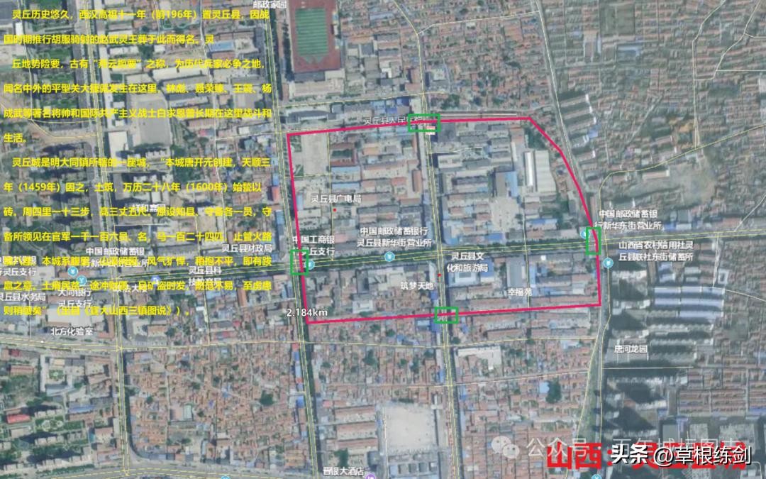 灵丘城是明大同镇所辖的一座城,《宣大山西三镇图说:“本城唐开元创建,天顺三年(1459年)因之,土筑,万历二十八年(1600年)始甃以砖。周四里一十三步,高三丈五尺。原设知县、守备各一员,守备所领见在官军一千一百六员、名,马一百二十四匹,止管火路墩八座”。