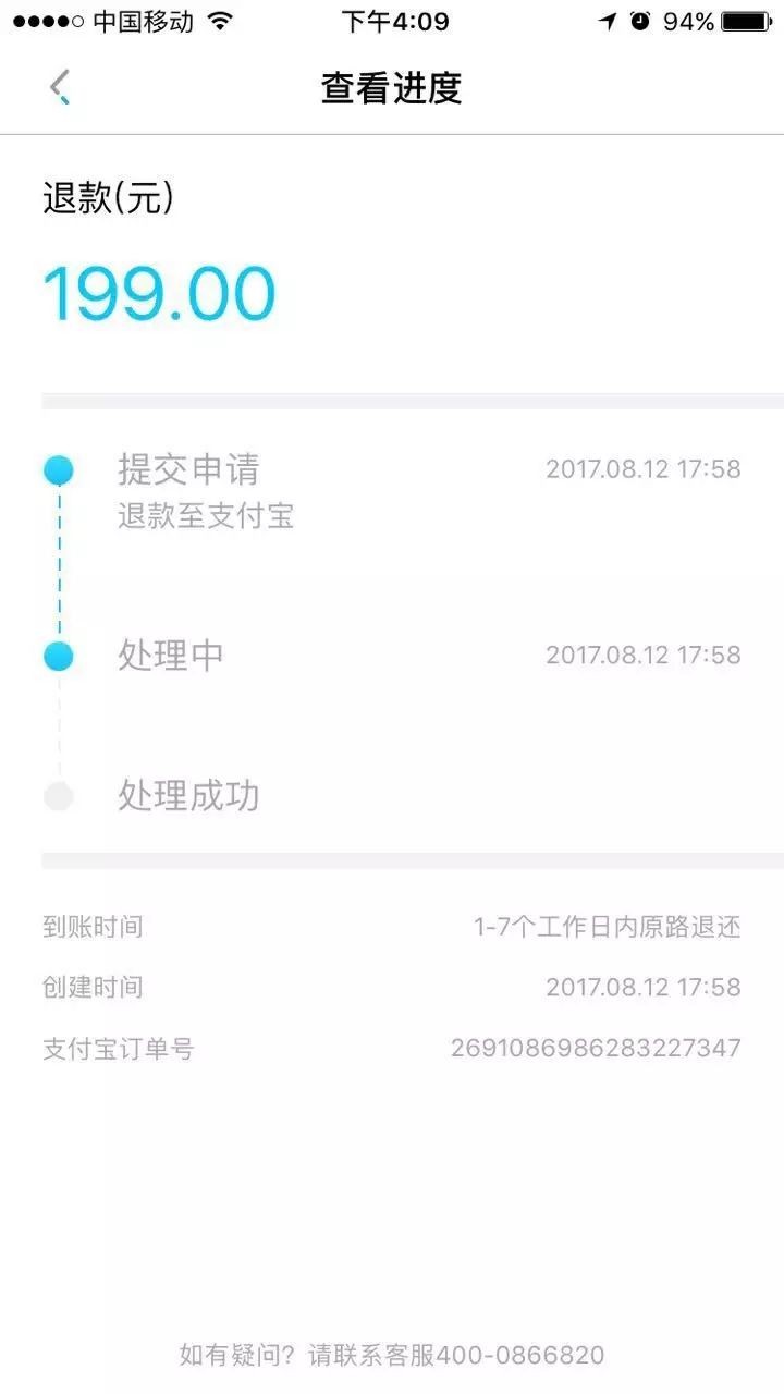 12日上午,商学院记者对小鸣单车的退款流程进行体验。当日注册小鸣单车并微信支付了199元押金,10点13分时提交退款申请,此时app明确显示该退款还在处理中,到账时间是1到7个工作日原路退还。