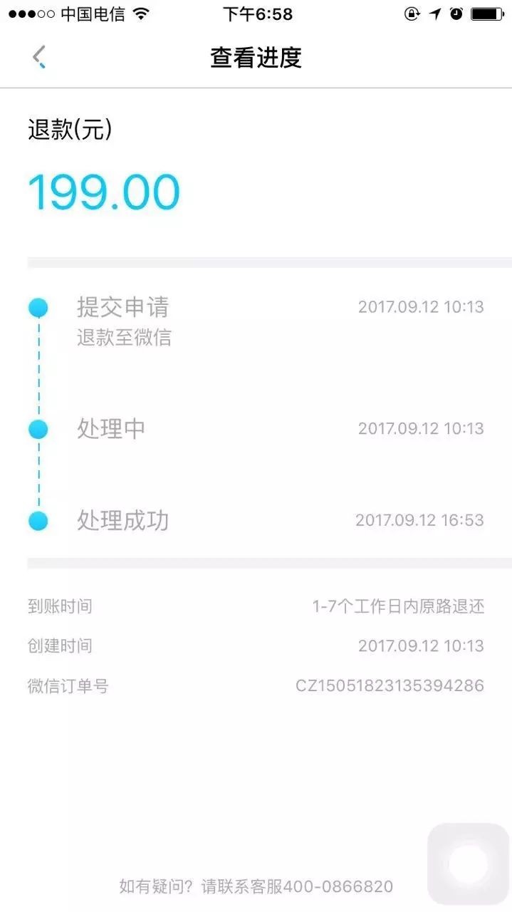 消费者提供的退款进度截图显示,8月12日晚17:58分申请退款,页面显示“1-7个工作日内原路退还”。也就是说,最晚8月19日,这笔押金就应当退回到消费者的账户中。然而,截至9月12日,消费者依然没有见到这笔退款的踪影。更让他觉得可怕的是,小鸣单车的客户端电话为空号,直到后来才能接通。