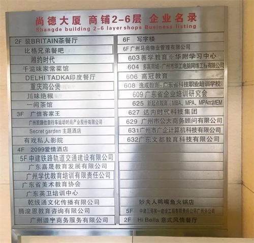 (图为广东省广州市天河区五山路141号尚德大厦楼道商铺显示目录)