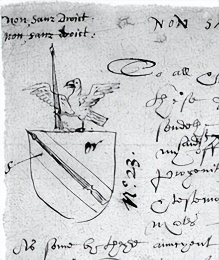 莎士比亚的纹章,如申请授予约翰·莎士比亚纹章的初稿所示。它以一支矛作为家族名字的双关语
