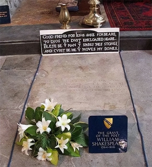 莎士比亚死后两天被埋葬在圣三一教堂的圣坛上。墓志铭刻在盖着他的墓碑的石板上,其中包括一个诅咒,禁止移动他的骨头,这在2008年修复教堂时被小心地避免了。