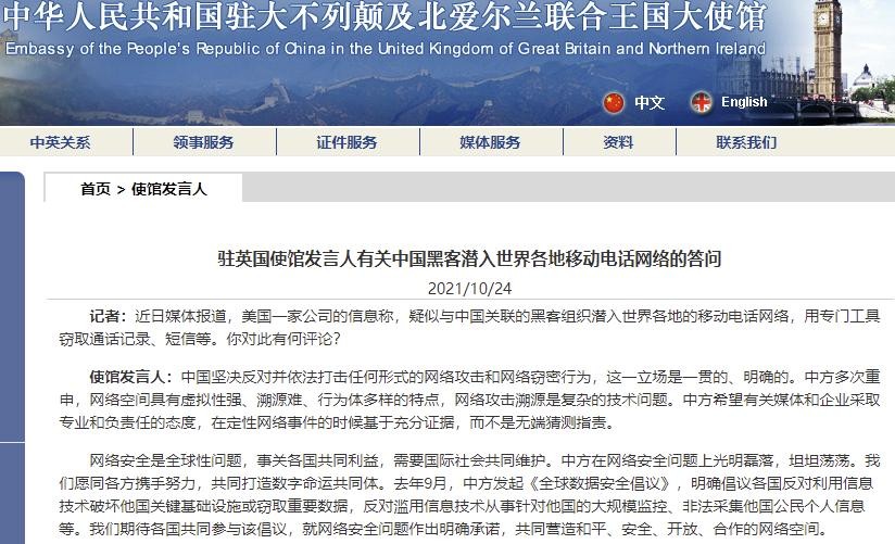 10月24日,中国驻英国大使馆网站消息,驻英国使馆发言人有关中国黑客潜入世界各地移动电话网络的答问,具体内容如下。
