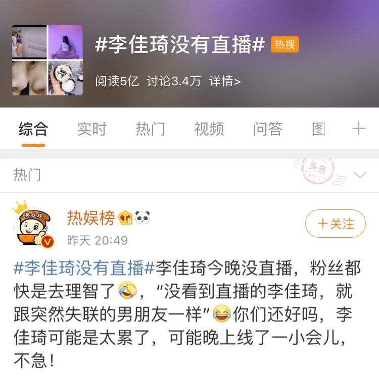 昨日,李佳琦没有像往常一样准时打开直播间和粉丝们见面,一天没有直播,引起了众粉丝的热议,还上了微博的热搜榜!大家都纷纷猜测今天李佳琦没有直播的原因。随后,李佳琦发文表示:“所有女生抱歉,我今天身体不舒服,今天不直播。”女粉丝们纷纷表示让他注意身体,好好休息,还说道:没看到直播的李佳琦,就跟自己的男朋友突然失联了一样,心慌慌~