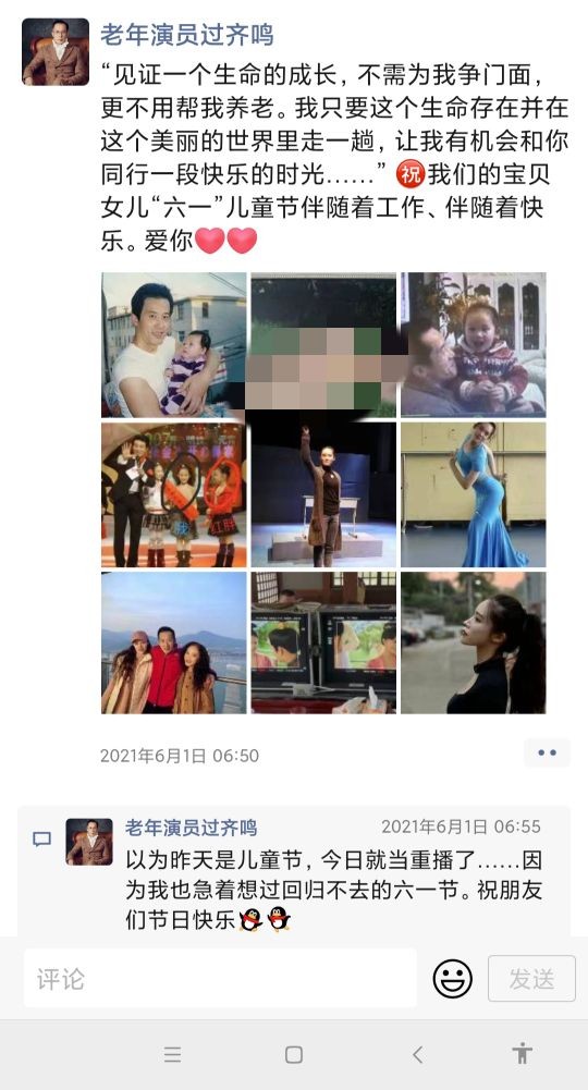 接到网友投稿,在刚刚过去的六一儿童节当天,一位老戏骨演员过齐鸣,在朋友圈发了这么一则动态,让这位网友和笔者都深受感动,深刻地感受到了一位老父亲对女儿深深的爱。作为一名父亲,过齐鸣是宽容的开明的,作为他的女儿过山月,也是幸福的快乐的。