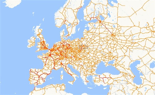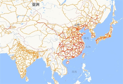 红色线路是高铁,地图上看,主要集中在中国、欧洲、日本。印度虽然铁路里程、密度高,但基本没有高铁线路。