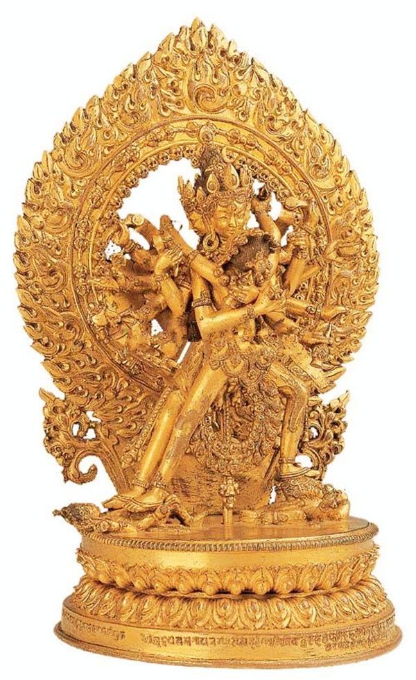 此胜乐金刚造像,腰围虎皮,象征无畏和勇猛;左腿屈,足下踩时间符号女;右腿伸,足下踩玛哈得瓦神。足下是双层仰莲俯莲底座,表示出离尘世。