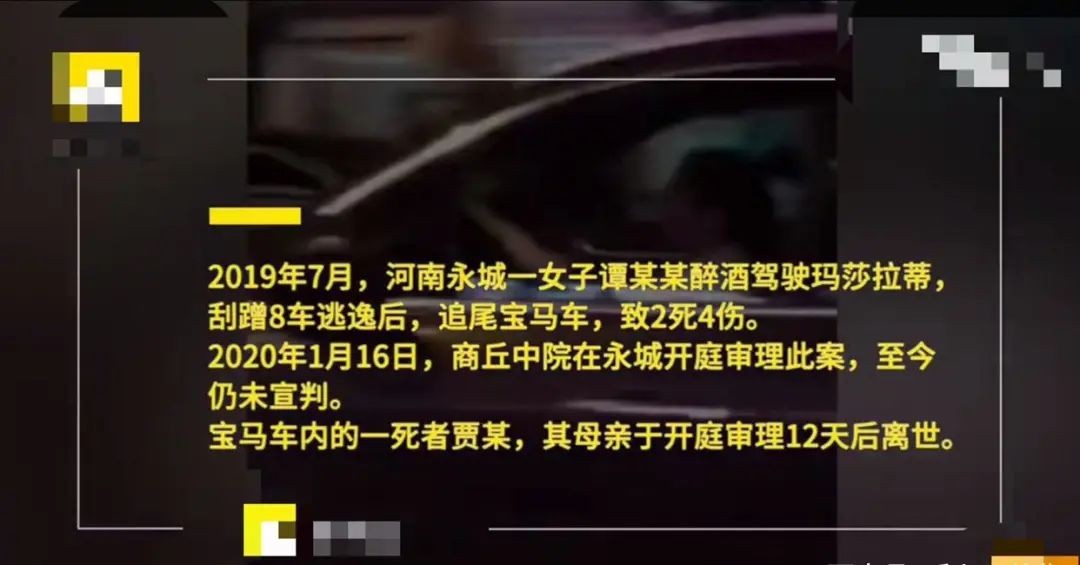 2019年7月3日晚,谭明明醉酒后驾驶玛莎拉蒂,先后与8辆轿车发生剐蹭,随后追尾撞击一辆等红灯的宝马汽车,共造成2死4伤。