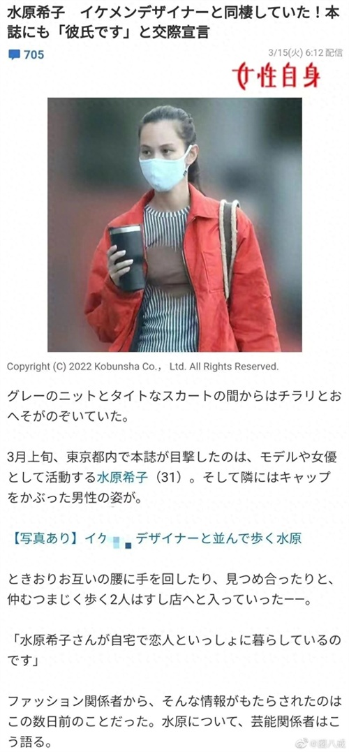 3月15日,有日本媒体拍到日本女星水原希子与一名陌生男子甜蜜出行的画面。