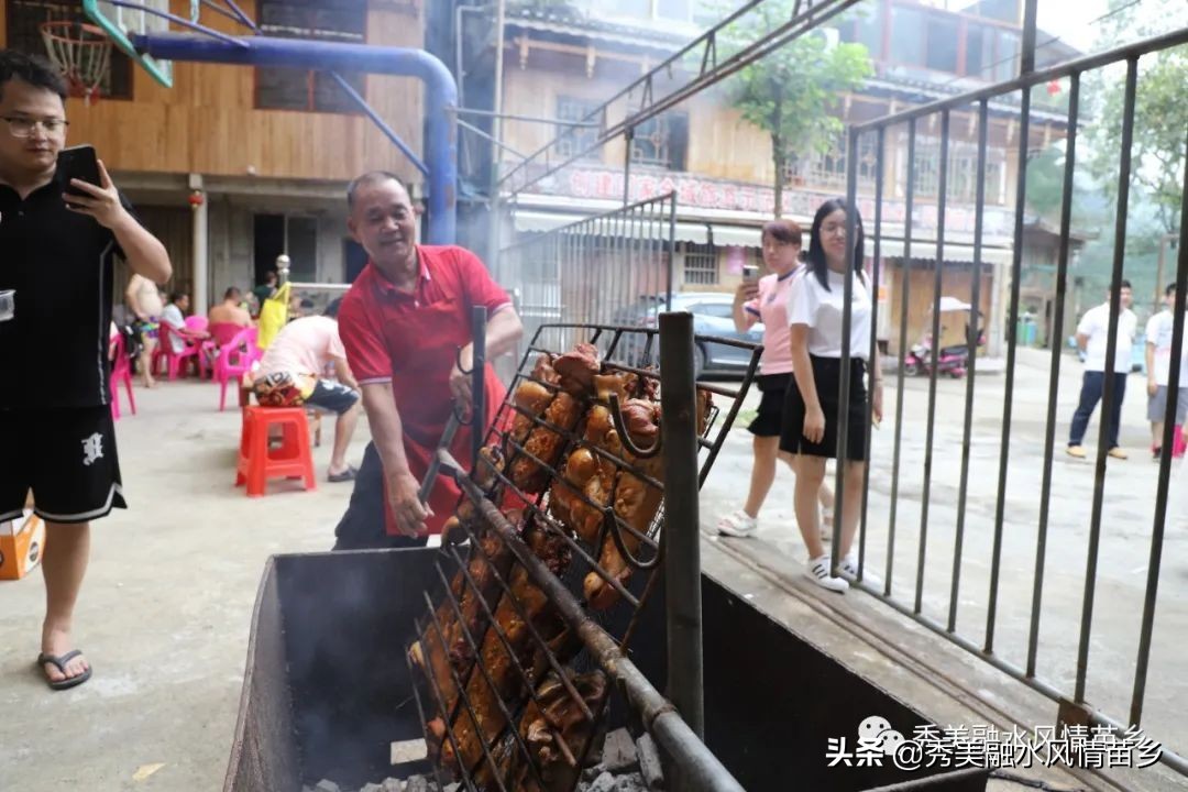 在香粉乡雨卜苗寨的寨门前,公路两旁停放着许多前来旅游、休闲、度假的汽车。雨卜苗寨的六甲河边,商家们在岸上搭起了帐篷,游客在岸边烧烤、喝啤酒、下水游泳,十分惬意。