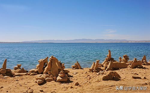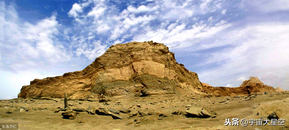 外星人遗址坐落在托素湖南岸,远远望去,高出地面五六十米的黄灰色的山崖有如一座金字塔。