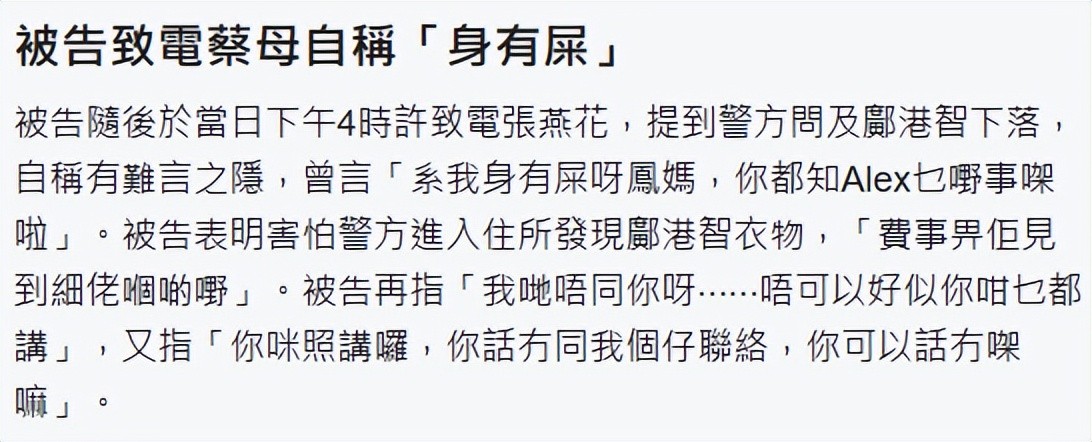 警方走后,前婆婆打电话给蔡天凤妈妈,提到警方到访一事,自称有难言之隐,曾说“是我有问题阿,凤妈,你也知道Alex的情况。”