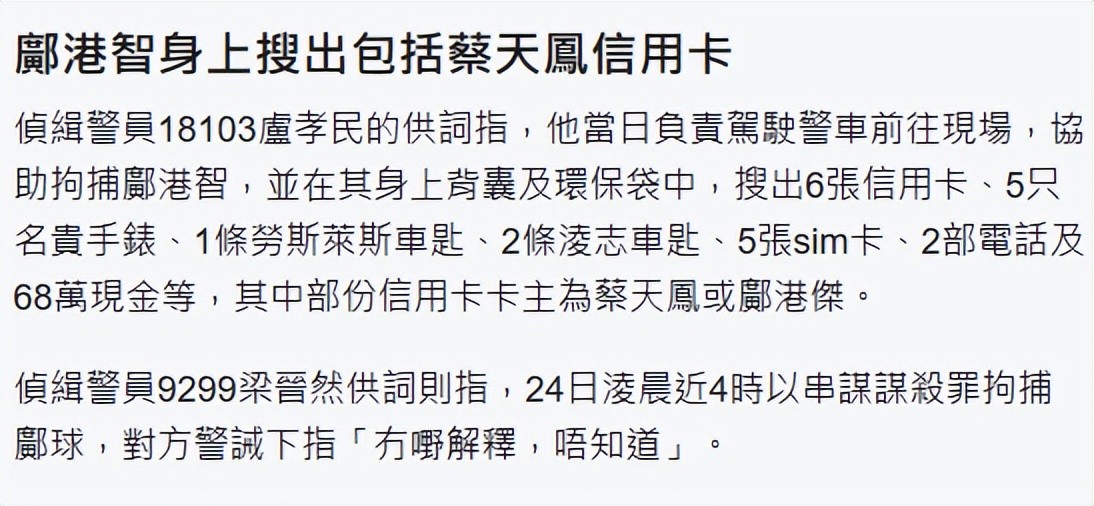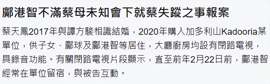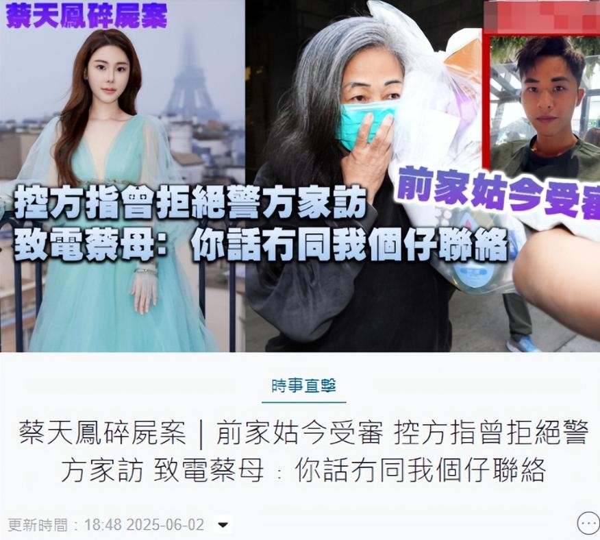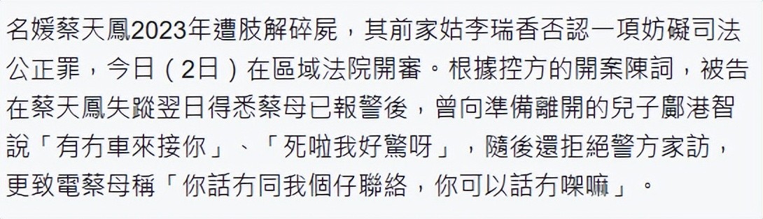 据悉,蔡天凤于2023年2月21日遭到前夫一家杀害,当天晚上11时,蔡天凤的丈夫谭方骏及母亲张燕花到长沙湾警署报案,不久后蔡母接到前夫邝港智打来的电话,邝港智情绪激动,不满蔡母在没有通知他的情况下报案。