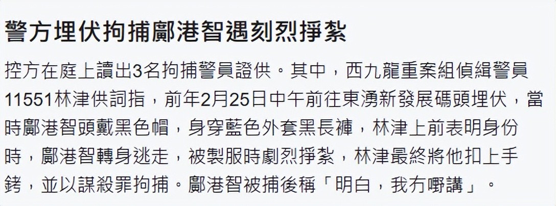 24日凌晨,警方以协助罪犯罪拘捕前婆婆,翌日下午1时许,在码头逮捕前夫邝港智,前夫当时剧烈挣扎,被戴上手铐后才认罪,称“明白,我没东西要讲。”