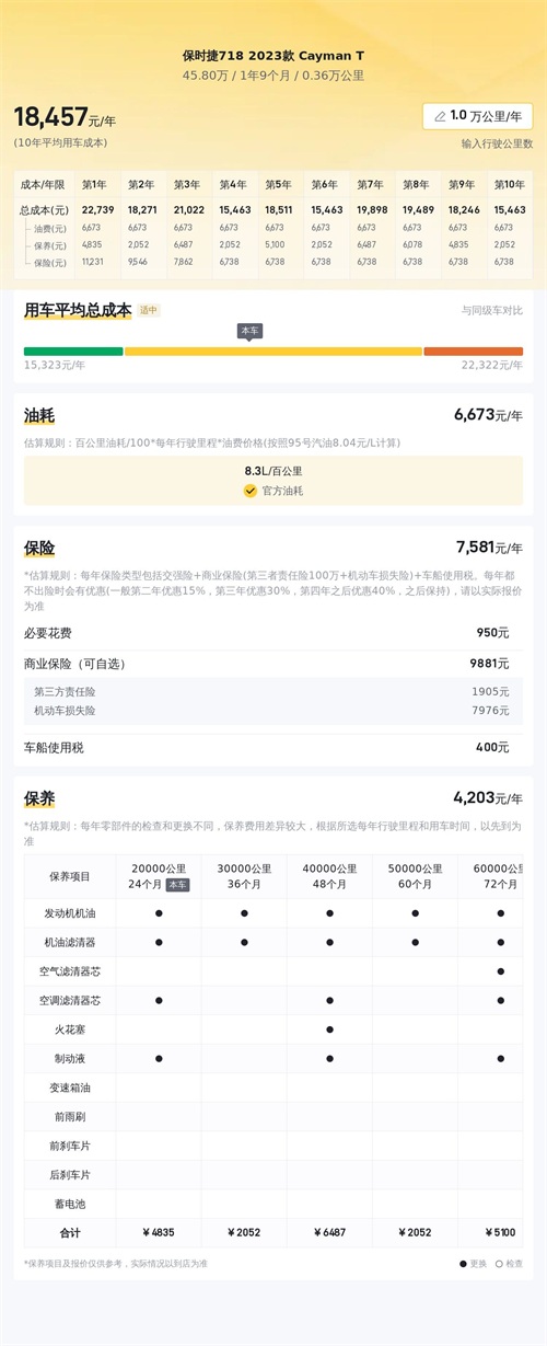 根据当前市场行情,这款保时捷718 2023款 Cayman T的二手车价格在50.07万至59.68万之间,而该车的报价仅为45.8万元,相较于市场行情来说价格较低,具有较高的性价比。在用车成本方面,该车的燃油消耗为8.3L/100km,相较于同级别车型来说属于正常水平。车辆保险费用约为13402元/年,保养费用约为8720元/年,洗车费用约为1680元/年,综合用车成本约为31485元/年,相较于同级别车型来说属于正常水平。