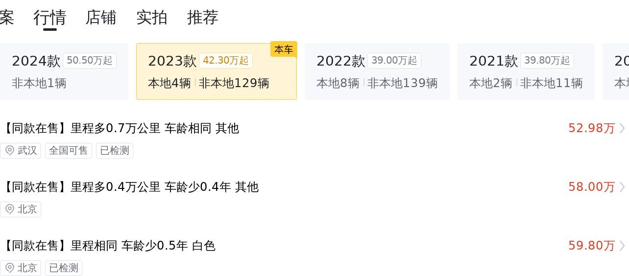 该车与2023年2月在深圳上牌,目前行驶里程为3600公里,车辆颜色为白色,新车指导价为66.1万元,目前二手车报价为45.8万元。该车目前还未进行过户,排放标准为国六。