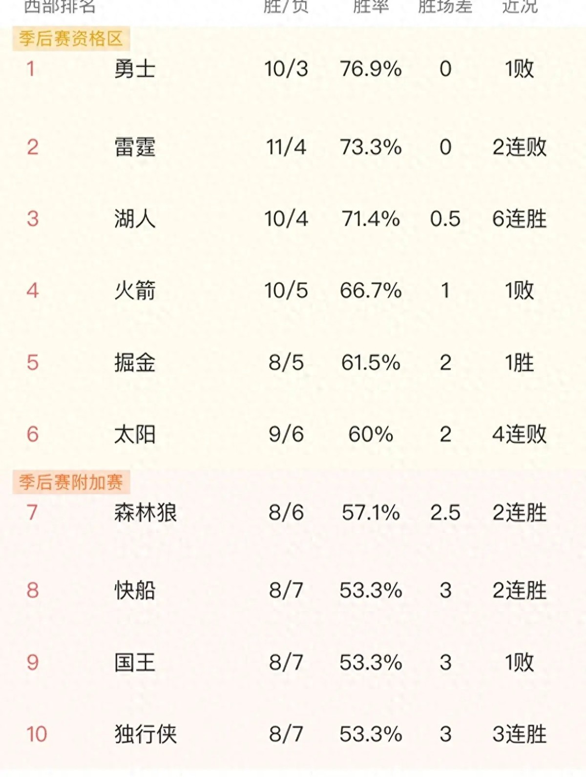NBA最新排名 勇士西部第1 雷霆2连败 湖人第3 掘金第5 骑士东部第1