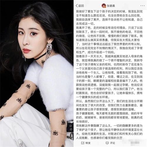 然而,随着华晨宇的宣布,张碧晨也在微博上发表了一篇长文,写出了生下这个孩子的来龙去脉和自己的心路历程。