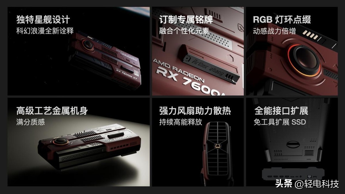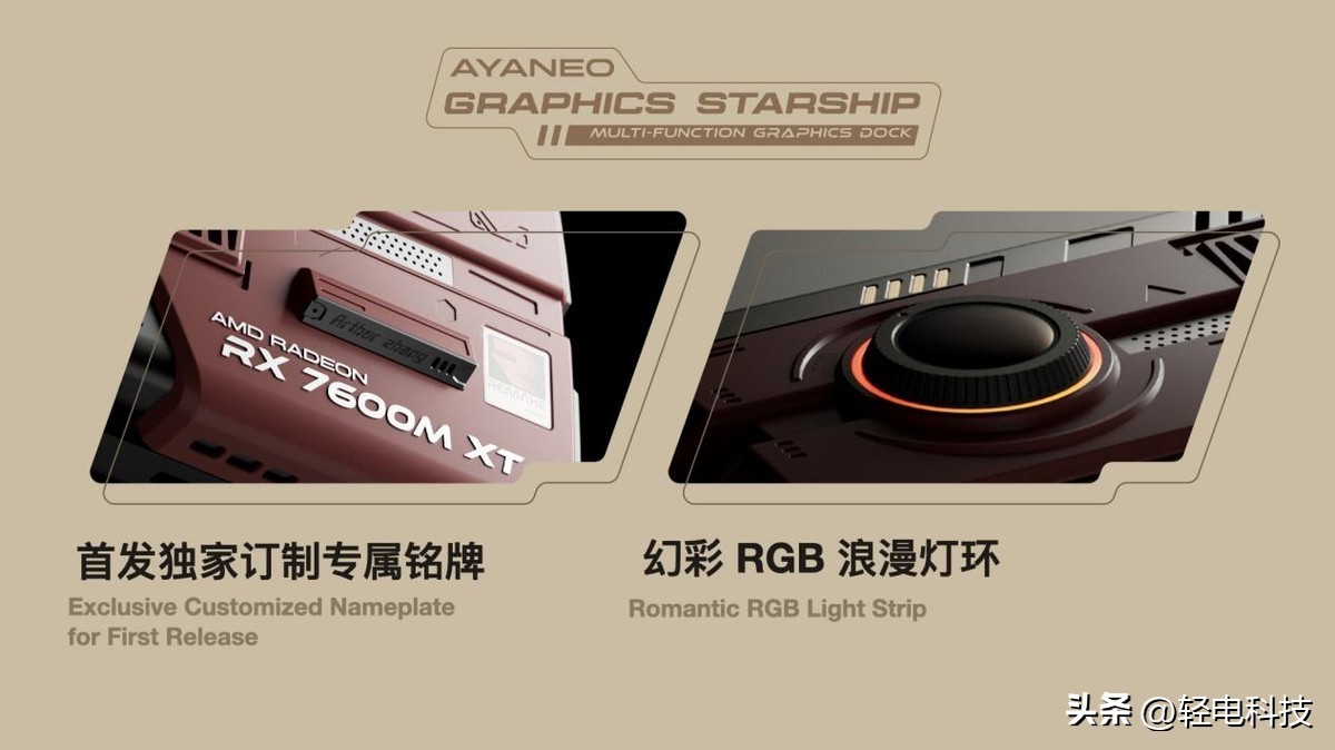 AYANEO 星舰显卡坞 AG01 融入个性化元素,独家订制专属铭牌;更有「性能提升 100%」的幻彩 RGB 浪漫灯环,独特外观和精致质感让其成为玩家桌面上的手办级桌搭神器。