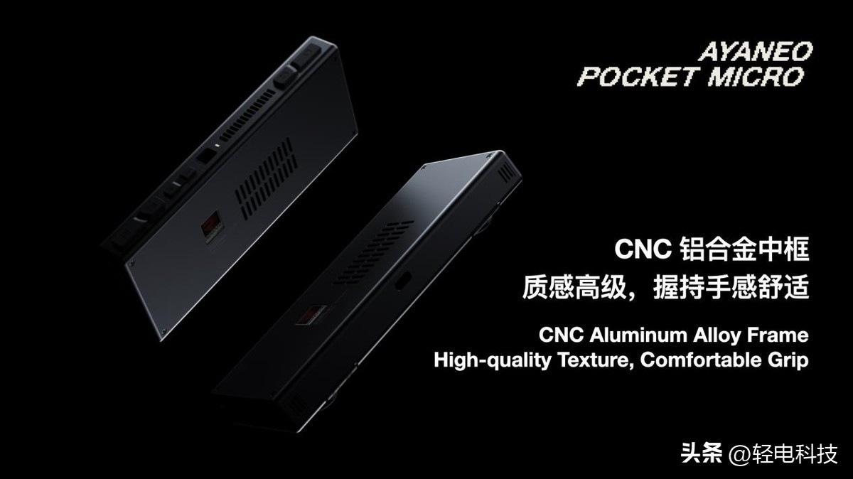 不仅如此,AYANEO Pocket MICRO 将 AYANEO 极简设计风格与高档工艺有机结合,配备旗舰安卓掌机 Pocket S 同档 CNC 铝合金中框,拥有超越同类掌机的高级质感,圆润柔和的边框线条带来舒适握持手感,是横版复古掌机里当之无愧的颜值工艺天花板。