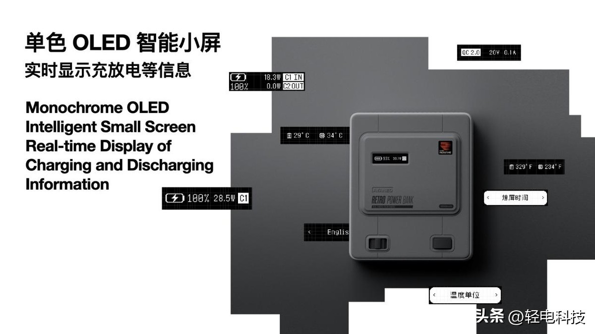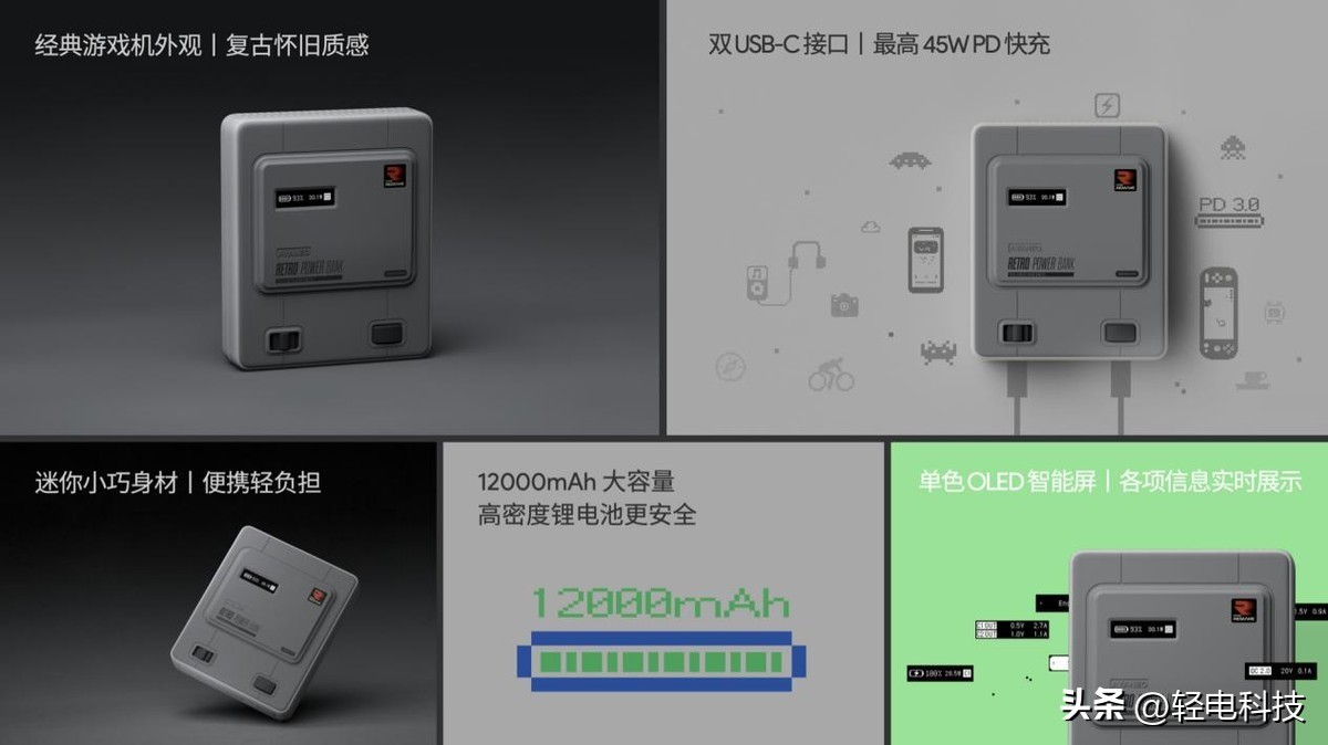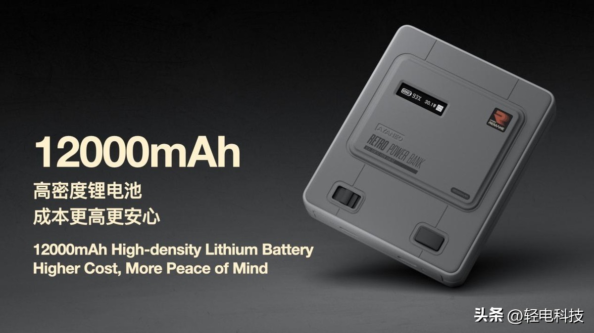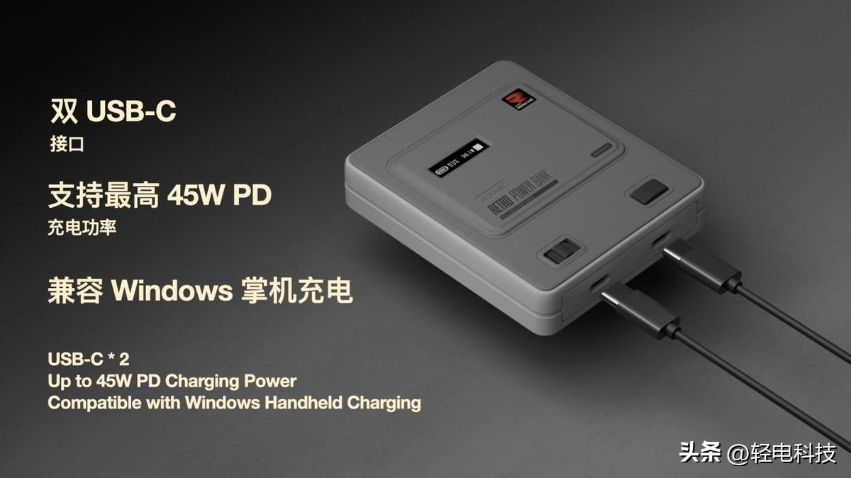 AYANEO Retro Power Bank 配备单色 OLED 屏幕,可以实时显示电量、充放电功耗等信息;更安全的 AYANEO 掌机同款 12000mAh 高密度锂电池,双 USB-C 接口支持同时输出,单口最高 45W PD 快充,兼容 Windows 掌机充电,解决续航焦虑问题。
