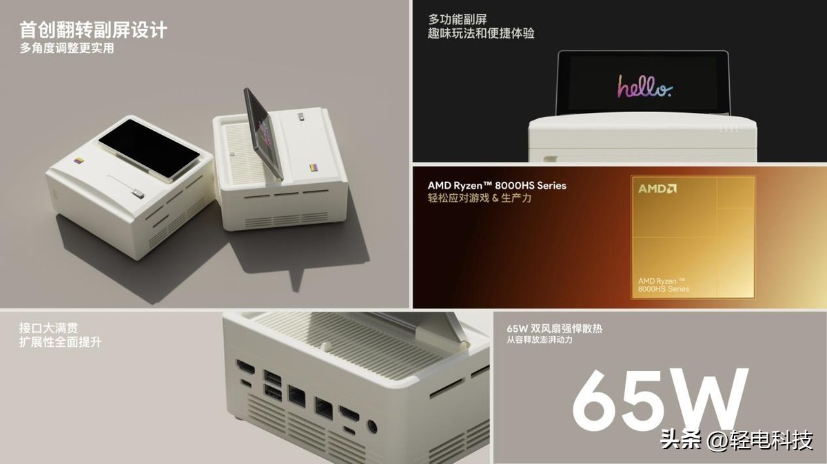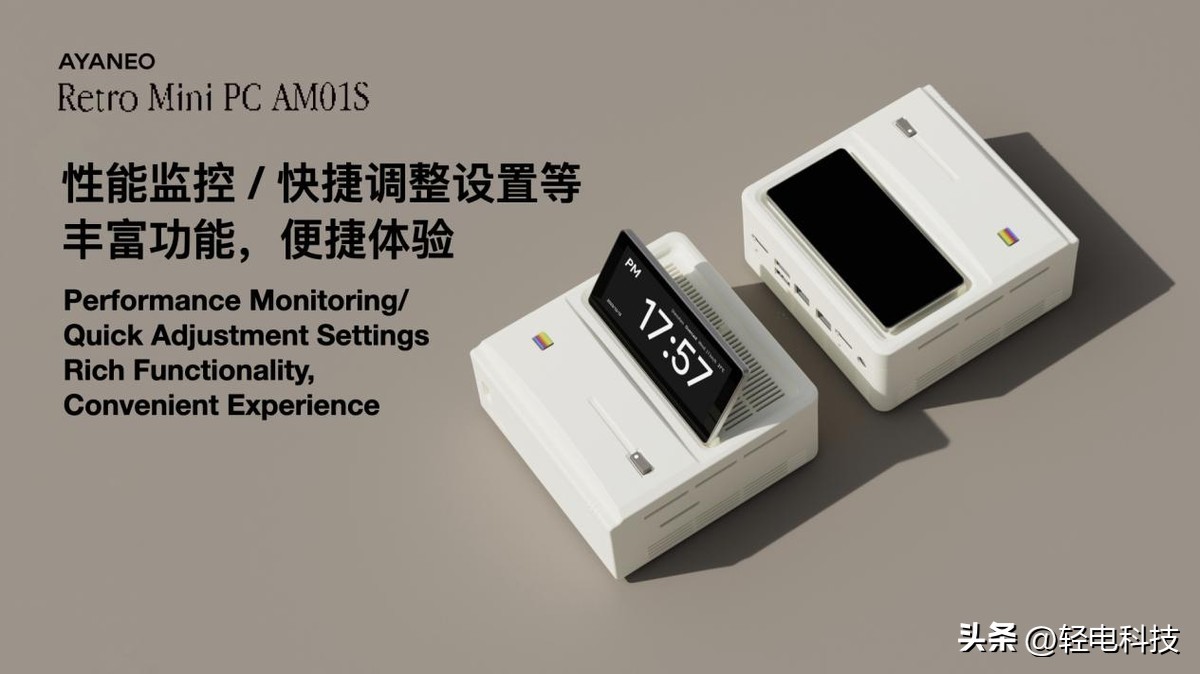 AYANEO Retro Mini PC AM01S 引入真正的屏幕,并且在 Mini PC 领域首创翻转屏幕设计,可以实现多角度调整,有效提升观看信息和点按操作的体验;智能副屏能够提供性能数据监控、调整性能模式等便捷功能,独特设计和实用体验高度融合。