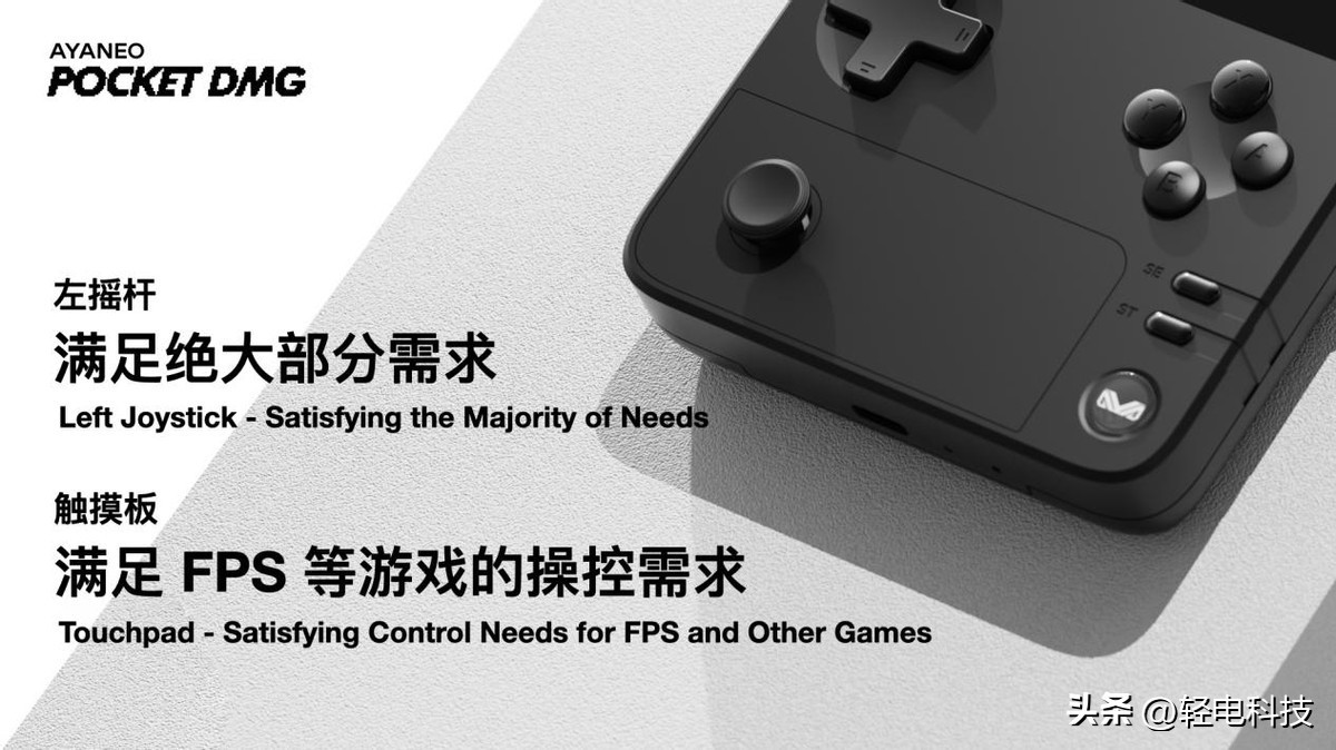 操控方面,AYANEO Pocket DMG 打破过往竖版掌机忽视体验而盲目加入双摇杆的传统,基于需求洞察和自身的设计沉淀,率先采用左摇杆+触摸板的创新设计,保持正面布局的视觉平衡和简约设计,带来区别于其他竖版掌机的领先体验。