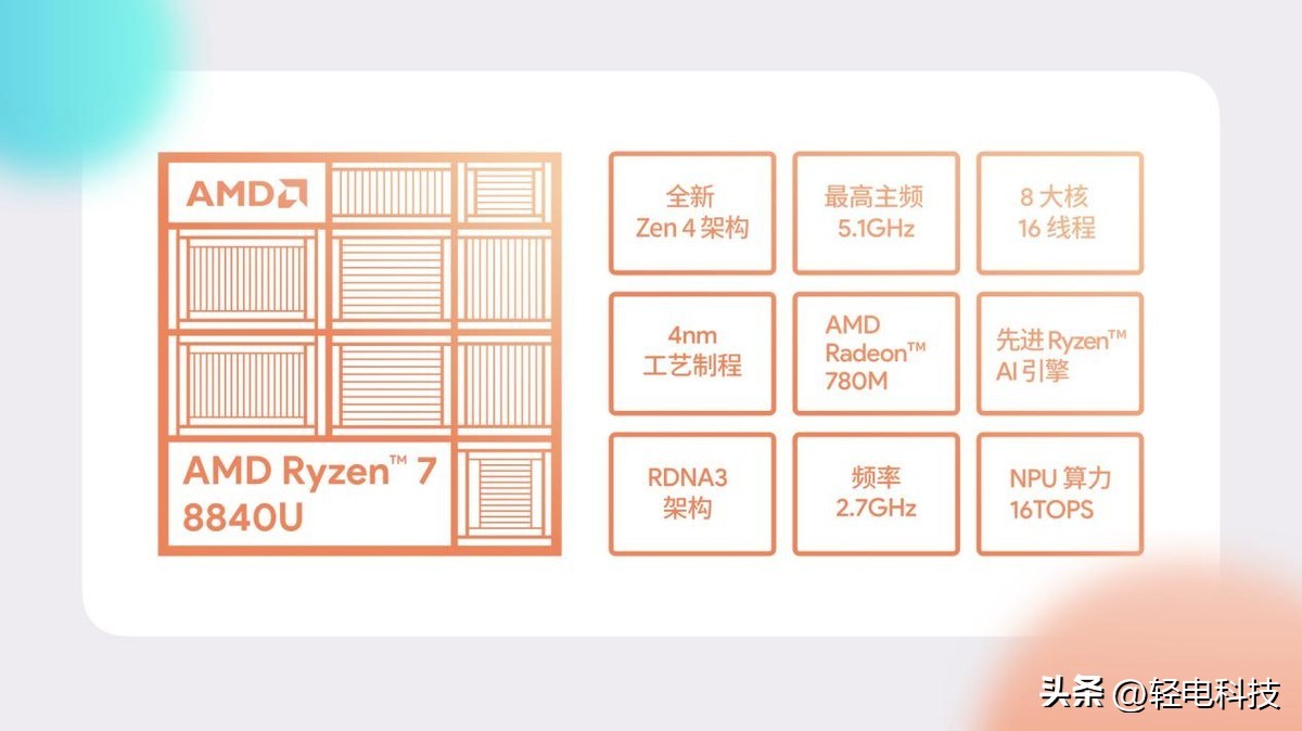 AMD Ryzen™7 8840U 所搭载的 XDNA AI 核心速度相比 7840U 提高 60%,带来高达 16TOPS 的强大 AI 运算能力,低功耗能效表现更加优秀。