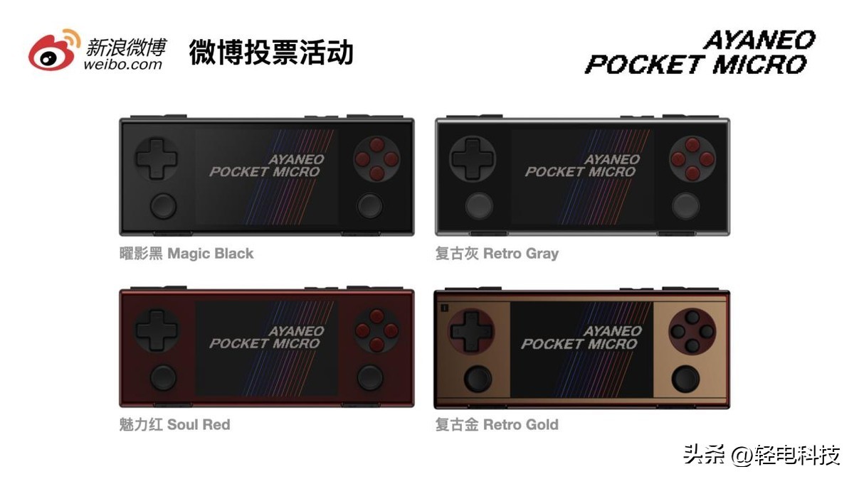 为感谢玩家一直以来的支持和热爱,AYANEO 将在微博举行「AYANEO Pocket MICRO & 星舰显卡坞 AG01 配色选择」投票活动,由玩家投票决定最终推出哪些配色。