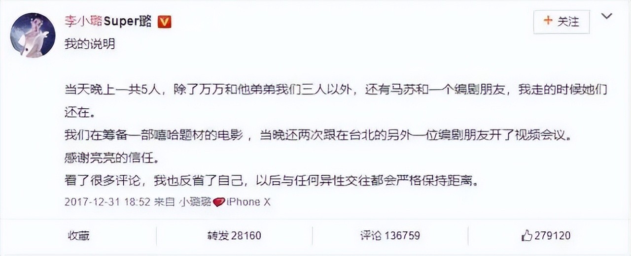 而李小璐本人也在,不久后发出声明,说明了当晚的情况,并表示两人并不是单独相处,其中还有马苏和另一位朋友只是在讨论一部有关嘻哈题材的电影。