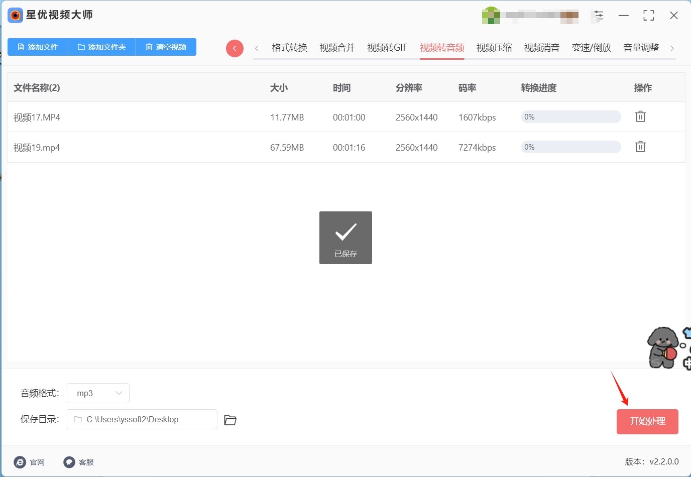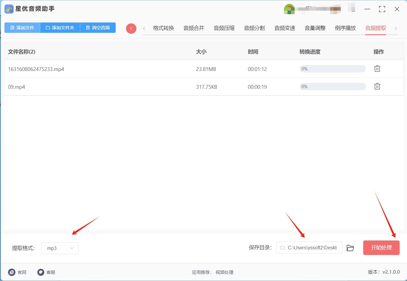 步骤4,在选择完音频格式和调整好其他设置后,点击右下角的【开始处理】按钮,软件就会开始自动处理。转换的速度取决于视频文件的大小及电脑的性能。一般情况下,转换过程相对较快,尤其是在使用较为简便的设置时。