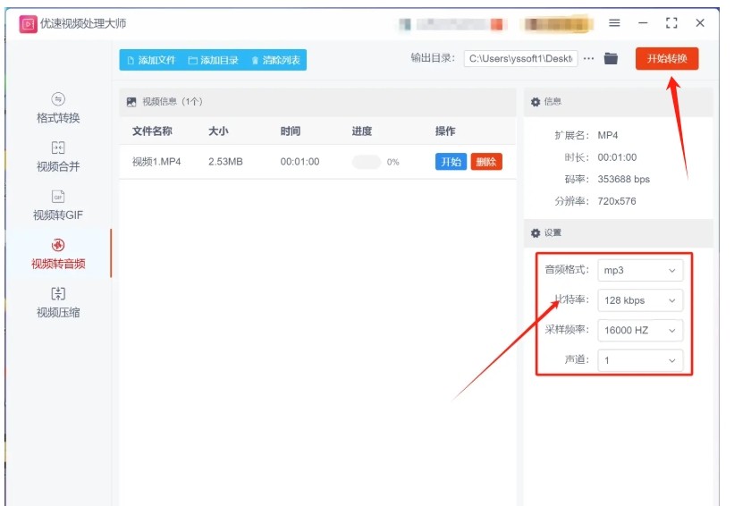 确认所有设置无误后,点击软件右上角的【开始转换】按钮,软件将自动启动视频转音频的转换程序。等待转换过程完成。