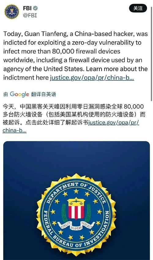 美国中情局近日发布悬赏令,以千万美元通缉中国红客关天峰。据美方指控,关天峰攻破8万多家以美国为主的企业和机构防火墙设备,窃取海量数据并对美国核心网络造成严重破坏。涉及的领域包括能源、金融、医疗等,对美国网络安全形成了直接威胁。