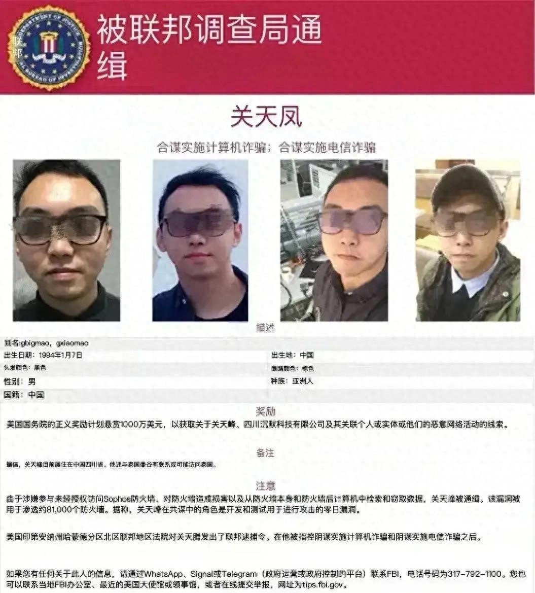 美国悬赏1000万美元捉拿我国四川黑客小伙关天峰