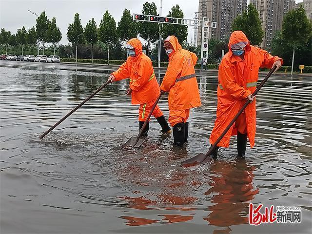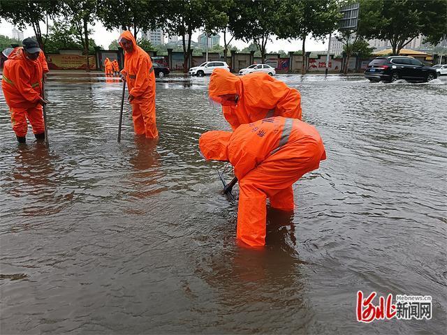 8月8日,邢台迎来一轮强降雨过程。邢台经济开发区易积水路段,该市环卫公司调集员工800余人分组全力排水、巡回保洁。通讯员张玉莲摄